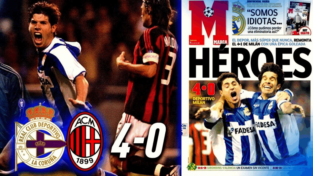10 RC Deportivo 4-0 AC Milan (cuartos de final Copa de Europa 2004): El AC Milan era el vigente campeón europeo y el mejor conjunto del planeta. Cafú, Maldini, Gattuso, Pirlo, Kaká, Seedorf, Shevchenko o Rui Costa con Carlo Ancelotti en el banquillo. Al Dépor le había metido ¡8! el AS Mónaco en la fase de grupos. Habían tenido que vender a Makaay, Manuel Pablo se había roto la tibia, Naybet y Djalminha (que ya no jugaba nada) tenían 34 años, Fran 35 castañas y Mauro Silva ya contaba con 36. En la ida Kaká baila al Dépor y los italianos ganan por 4-1. La vuelta en Coruña tenía que ser un trámite. En casi medio siglo de Copa de Europa nadie ha remontado tres goles en una eliminatoria. Riazor se llenó. Siempre se llena, pase lo que pase. A los cinco minutos Pandiani anota a la media vuelta y veinte minutos después Juan Carlos Valerón marca el que probablemente fuese el primer gol de cabeza de su vida. Con el estadio enloquecido, Albert Luque colocaba un balón en la escuadra derecha de Dida. Con el 3-0 y la eliminatoria levantada, los once colosos blanquiazules marcharon al vestuario galopando. Paolo Maldini se preguntaría después si no estarían dopados. No lo estaban. Simplemente sabían que el trabajo no estaba hecho. En la segunda parte Fran, el eterno capitán, firmaba el 4-0 en un acto de justicia poética. Después sí, después tocó aguantar unos minutos finales de embestida a la italiana. Aquel 4-0 se convirtió en la mayor remontada nunca antes vista en la Copa de Europa. Con el tiempo fue superada. Pero lo que tardará mucho en superarse es que sea el pequeño el que le dé la vuelta a la tortilla y machaque al grande.