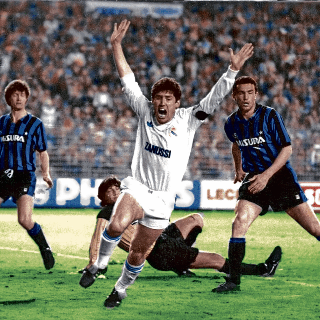 8 Real Madrid 3-0 Internazionale (semifinal Copa de la UEFA 1985): El primer milagro madridista ocurrió en los 70 con remontada al Derby County, pero la eclosión de la mística del Bernabéu es cosa de los 80. Antes, en época de Di Stéfano, el Madrid ganaba por aplastamiento. La década de los ochenta fue otra cosa. Se naufragaba fuera de casa y se remontaba en la Castellana ya fuese al Anderlecht (6-1) o al Gladbach (4-0). Fue cuando Jorge Valdano acuñó aquello del miedo escénico. La madre de todas las remontadas tuvo lugar ante el Inter. En San Siro se cae por 2-0 y a Juanito le meten el micro en la boca nada más acabar el partido para, con una sonrisa de oreja a oreja, soltar aquello de “90 minuti en el Bernabéu son molto longo”. Juanito, ya en su recta final, había sido suplente. En la vuelta será titular. Butragueño es baja por lesión. Pero eso no había sido lo peor. Amancio, técnico blanco, había pillado tras la derrota a Juanito y a Lozano con dos señoritas italianas. A Lozano lo echarán ese verano, pero Juanito es mucho Juanito. Las vacas sagradas le hacen la cama a Amancio y Luis Molowny es el nuevo entrenador. En medio de un incendio de críticas Juanito y Santillana toman las riendas. El cántabro anota al poco de iniciar y luego, con uno de sus eternos cabezazos, pone el 2-0. El éxtasis llego al poco de iniciarse la segunda parte cuando un tiro cruzado de Michel bata a Walter Zenga. El público, en pie, gritaba ¡Así, así, así gana el Madrid! El Inter no se rinde y cuenta con un par de ocasiones, pero el Madrid camina con paso firme a por su primer título de Copa de la UEFA.