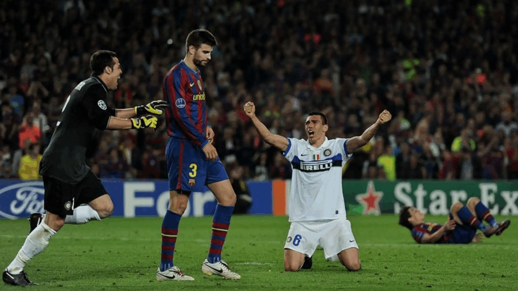 5 FC Barcelona 1-0 Internazionale (semifinal Copa de Europa 2010): La única victoria de esta lista que se tornó en derrota. O la única derrota que se tornó en victoria. Un ejercicio defensivo mayúsculo. Una oda al trabajo de equipo y a la demostración de como un capitán es capaz de llevar un barco perdido a buen puerto. En la ida el Inter había ganado por 3-1. En la vuelta tocaba aguantar. Era el Barça el mejor equipo del mundo. Era, y sigue siendo, el equipo con mayor capacidad asociativa que jamás se ha visto. A los 28 minutos de partido expulsan a Thiago Motta. El Inter queda con 10 hombres. Es cuestión de tiempo que el Inter caiga. Pero no. El goleador Samuel Eto’o pasa a convertirse en lateral derecho y el ejercicio defensivo italiano es excepcional. El Barça acaba el partido con un 76% de posesión, pero apenas conseguirá lanzar en cuatro ocasiones entre los tres palos. Una de ellas, a falta de seis minutos para el final, terminará en gol y en una victoria insuficiente. El achique de espacios y la solidaridad defensiva del conjunto dirigido por Mourinho rozará la perfección. La formación 4-6-0 fue un castillo edificado por Mou que Guardiola no supo asaltar. Pocas veces se ha visto a un equipo de élite defender tan atrás. Y pocas veces se ha visto a un equipo de élite tan entregado, solidario y sacrificado por el bien común. En la ida, por cierto, el Barça había tenido la posesión, pero el Inter había atacado mucho y bien. Pocos recuerdan que el 2-1 fue obra de Maicon (lateral derecho) en un contraataque en el que acabó chutando en el área pequeña rival. La pena de Mourinho es que acabó cegado por aquel éxito defensivo y se olvidó de lo que era jugar con balón.