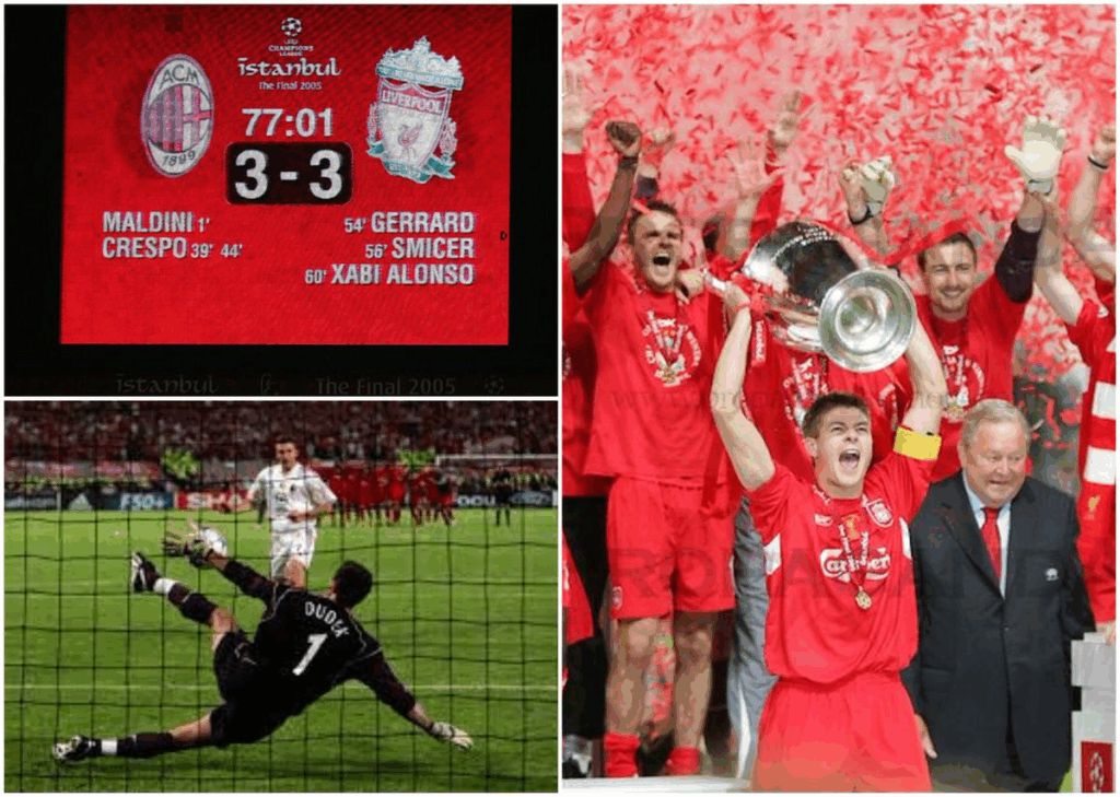 2 Liverpool 3-3 AC Milan (final Copa de Europa 2005): El AC Milan era favorito. Muy favorito. Y cumplió el pronóstico con creces. Al minuto de juego Paolo Maldini adelantaba a los rossoneros. Pirlo se hizo dueño del medio campo y Kaká barría hacia la mediapunta para que Cafú corriese la banda una y otra vez. El dominio italiano se certificó con dos goles de Hernán Crespo antes del descanso que ponía la final con un claro 3-0. Camino del vestuario, los más de 25.000 seguidores del Liverpool presentes en Estambul entonaban el You’ll never walk alone, himno oficioso de los reds. La sinfonía duró los quince minutos del tiempo de asueto para sorpresa y orgullo de Steven Gerrard y el resto de los chicos de Rafa Benítez. En seis minutos inolvidables, los que van del 54 al 60 de partido, Gerrard, Smicer y Xabi Alonso empataban el encuentro. El tanto de Alonso se originó tras un rechace de un penalti que él mismo había fallado. Entonces el Liverpool pecó de timorato y no tumbó a un Milan completamente grogui. Con una marcha menos, el encuentro se dirigió a una prórroga en donde el Milan decidió ir con todo a por el encuentro. Finalizando la segunda mitad del tiempo extra Shevchenko tuvo dos ocasiones clamorosas que acabaron en el limbo. Tocaba penaltis. Luego Ancelotti, entrenador italiano, confesaría que tras mirar a los ojos a sus jugadores ya contaba con perder el partido. Dudek hizo el resto. Emulando el legendario baile de Bruce Grobbelaar en la final de 1984, Jerzy Dudek se marcó un pasodoble, una bachata y una salsa para que tres rossoneros fallasen sus penaltis y le diesen al Liverpool la que entonces era su quinta Copa de Europa.