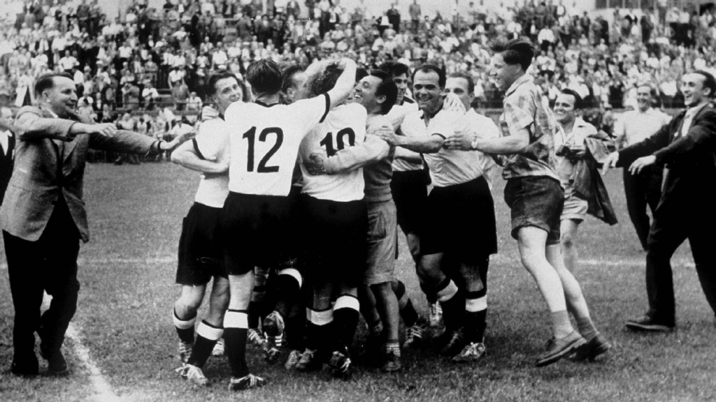 7 Alemania 3-2 Hungría (final Mundial 1954): En la primera fase ambas escuadras se habían enfrentado. 3-8 ganó Hungría. Los magiares eran el mejor equipo del mundo. Sumaban 33 partidos consecutivos sin perder. No sólo eran los triunfos. Era la manera de lograrlos. A través de un 4-2-4 con continuos movimientos, Hungría tenía un portero que jugaba el balón al pie, defensas que armaban y barrían y delanteros que bajaban a recibir el balón al medio campo. Era el fútbol total antes de que existiese el fútbol total. Hidegkuti organizaba una bacanal ofensiva que remataba Puskás. Ocurrió que en la final llovió. Y llovió mucho. Y Alemania contaba con unas botas Adidas de tacos regulables, una innovación de la época. Los húngaros se resbalaban y cuantiosas eran las caídas. Y Puskás, lesionado en el tobillo, era incapaz de correr. Los alemanes, además, contaban con Fritz Walter, un excepcional centrocampista que rendía bien en los días lluviosos, ya que una malaria contraída en tiempos de la II Guerra Mundial le impedía rendir bien cuando el sol abrasaba. Al principio nada de eso se notó. A los diez minutos el marcador ya era 0-2 para los magiares. Aquello estaba visto para sentencia. Tenía pinta de masacre. Pero no sería así. Antes del descanso los alemanes empataban. En la segunda mitad el agua golpeaba con fuerza los cuerpos de los jugadores y el balón se asemejaba a una roca. Hungría salió con todo tras el descanso a sabiendas que el depósito de gasolina estaba quedándose seco. Un lanzamiento al poste de Kocsis, un paradón de Turek a tiro de Puskás, otro lanzamiento al poste de Hidegukti y otro paradón de Turek a cabezazo de Kocsis.  A base de ganas, orgullo y algo de suerte Alemania sobrevive y se mantiene en pie. Por entonces el campo es un barrizal. Es el minuto 84 de la final cuando Rahm lanza un latigazo con la zurda que bate a un Grosics que resbala cuando va a atajar el balón. Un Puskás cojo aun conseguiría empatar el encuentro, pero el gol era anulado por fuera de juego. Hungría perdió la final y se diluyó como un azucarillo en los anales de la historia. Para Alemania fue la primera vez que se cantaba el himno con orgullo desde tiempos del III Reich y el inicio un carácter indomable y una fortaleza de hierro que los hará grandes en el fútbol mundial.
